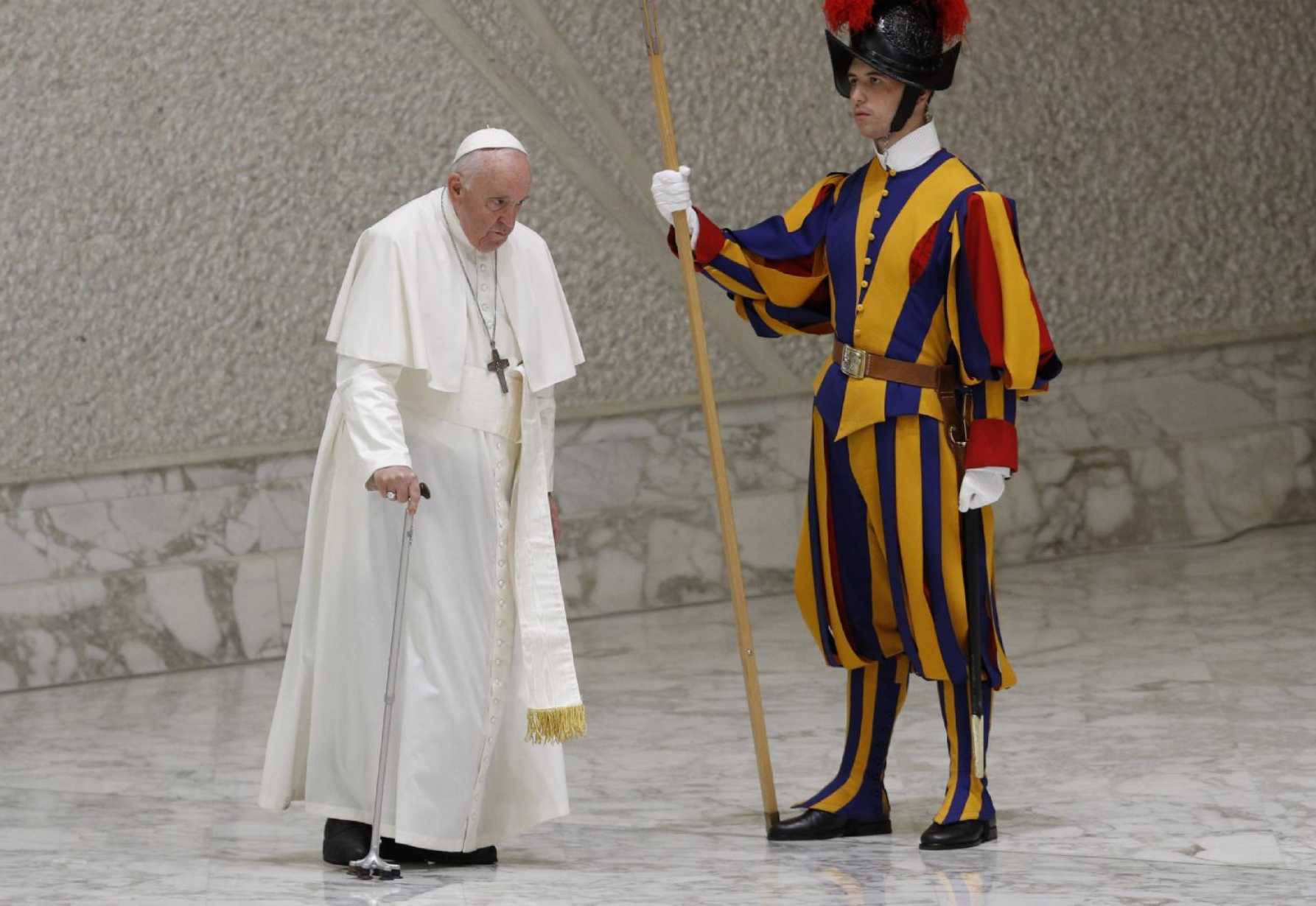 Pope Francis walks past a Swiss Guard as he arrives for his general audience in the Paul VI hall at the Vatican Aug. 3, 2022. (CNS photo/Paul Haring)