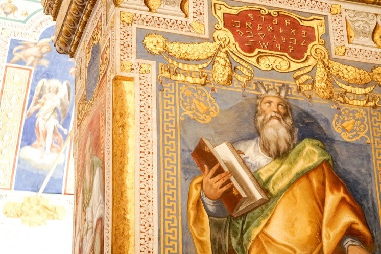 A fresco depicting Moses can be seen in this photo taken in the Sistine hall of the Vatican Library July 19, 2023. (CNS photo/Carol Glatz)