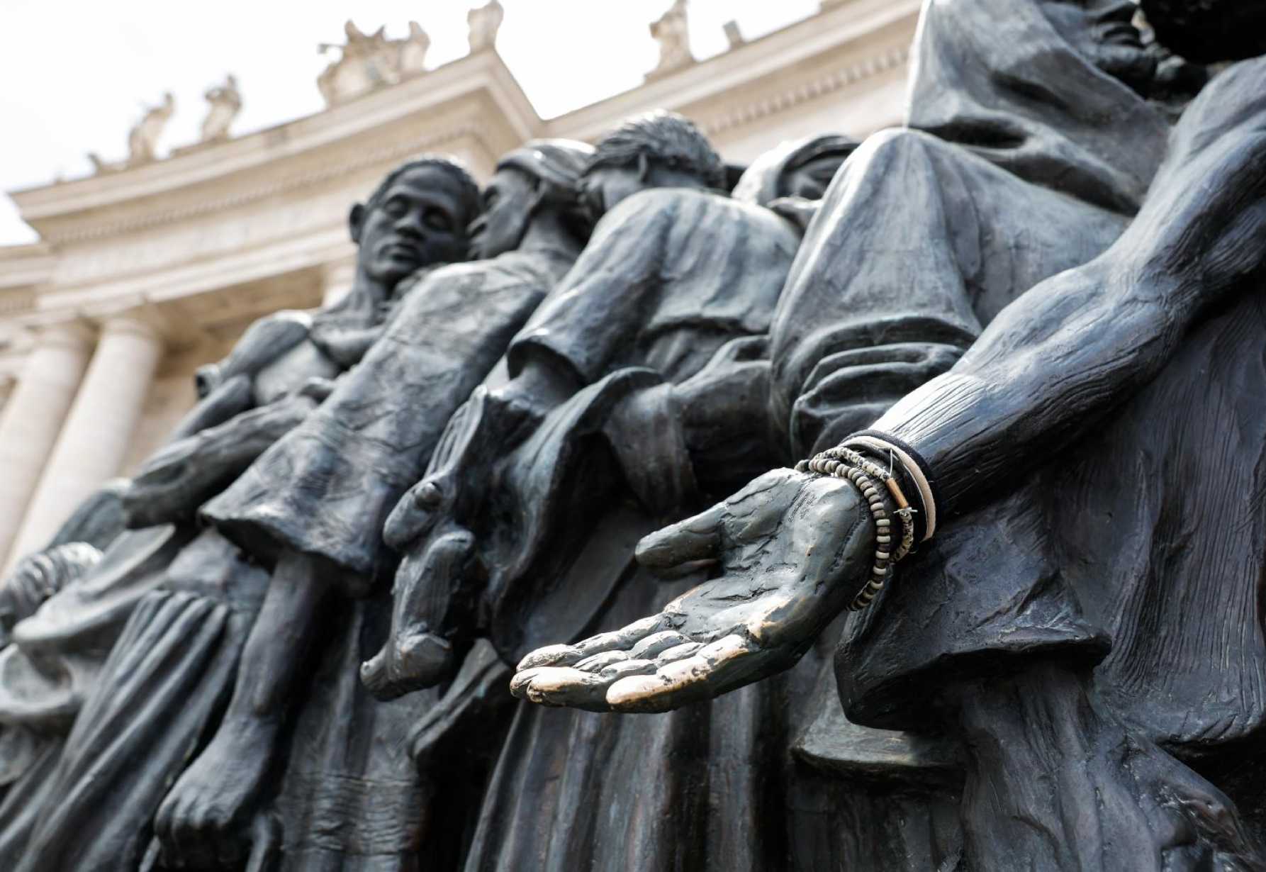A detail is seen of "Angels Unawares," a sculpture by Canadian Timothy Schmalz in St. Peter's Square at the Vatican, June 3, 2024. The sculpture depicts a boat with 140 figures of migrants from various historical periods and various nations. (CNS photo/Lola Gomez)
