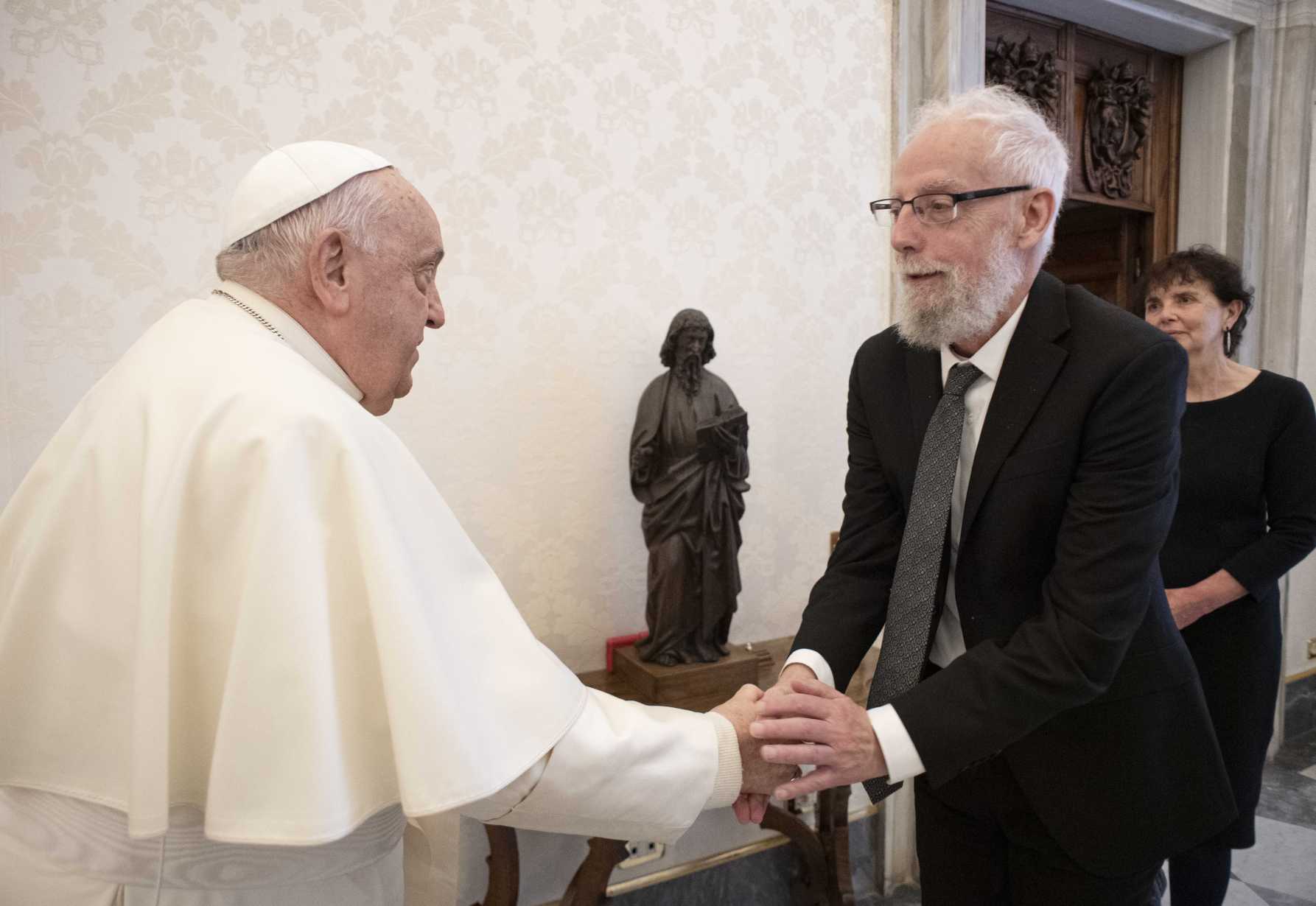 Pope Francis greets Cyril O'Regan, a professor at the University of Notre Dame and winner of the 2024 Ratzinger prize, during a meeting at the Vatican Nov. 22, 2024. (CNS photo/Vatican Media)