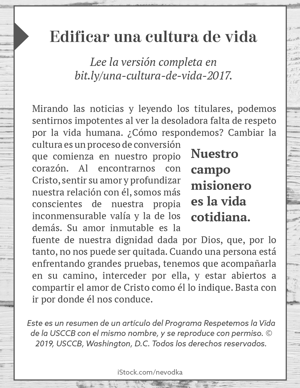 Provides basic principles to guide us in our missionary call to build a culture of life.