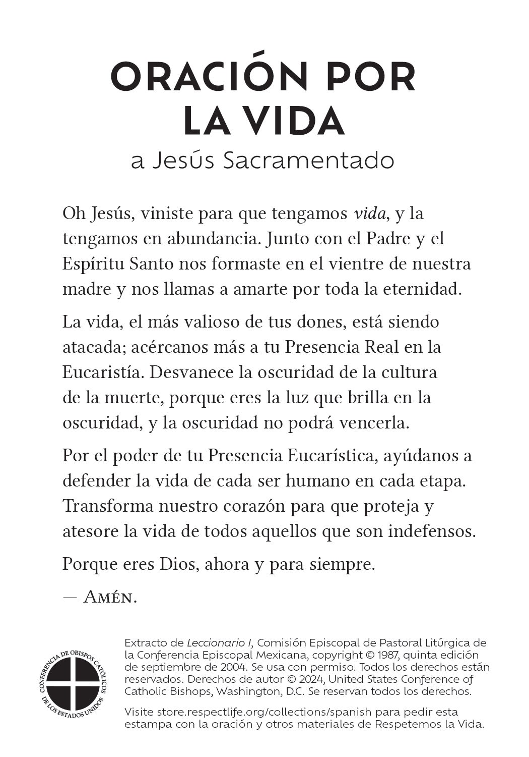 Por el poder de tu Presencia Eucarística, ayúdanos a defender la vida de cada ser humano en cada etapa. Transforma nuestro corazón para que proteja y atesore la vida de todos aquellos que son indefensos.