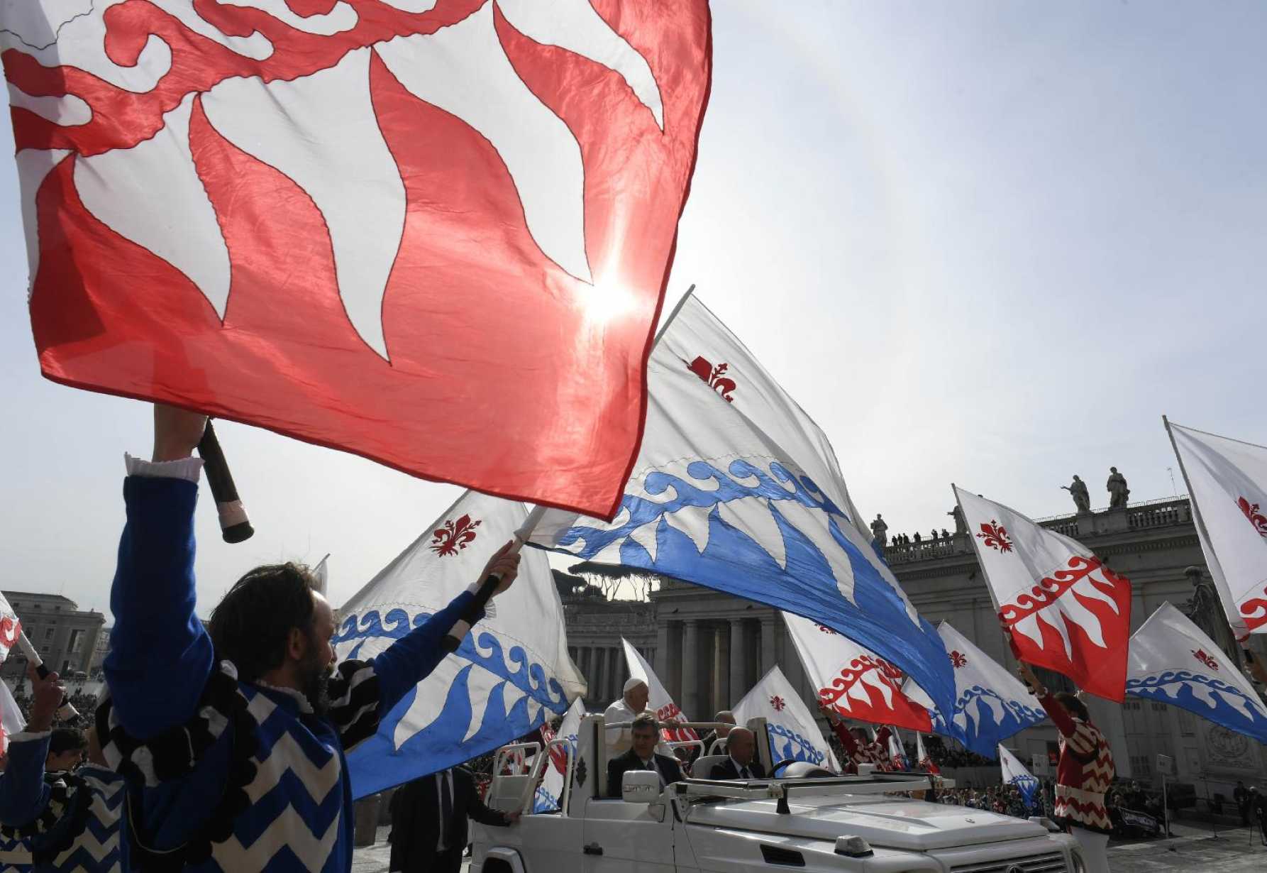 Pope Francis rides in his popemobile which passes by a group of traditional flag twirlers during his general audience in St. Peter's Square at the Vatican March 22, 2023. (CNS photo/Vatican Media)
