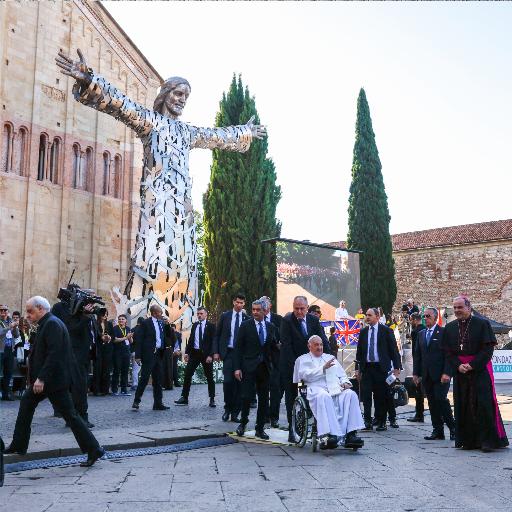 Before going to the Arena and to the prison, Pope Francis and about 5,500 children and young people were welcomed to the Basilica of St. Zeno by "The Embrace," a 32-foot-tall statue of a smiling Christ with his arms extended wide. The sculpture is made of 300 metal cutouts of children, women and men. The statue, commissioned by the Franciscan Custody of the Holy Land and made in Verona, was planned for the roof of a Catholic school in Jerusalem, and hopes are that one day it can be erected there.