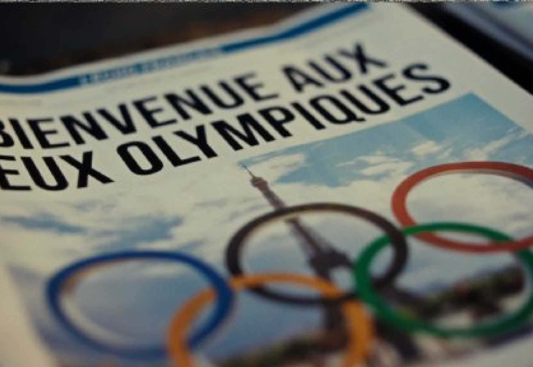 An illustration of the cover of a newspaper features the headline "Bienvenue aux Jeux Olympiques" (Welcome to the Olympic Games) above an image of the Olympic rings and the Eiffel Tower in Paris. (CNS photo/courtesy of IOC Media)