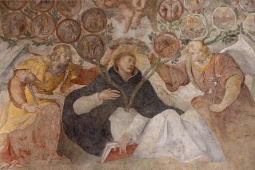 The first fresco visitors see upon entering the cloister is a large depiction of St. Dominic with Our Lady of the Rosary and "the tree of the 15 mysteries of the rosary." Dominican Father Daniel Als said members of the Confraternity of the Holy Rosary paid for the frescoes at the beginning of the 17th century, and so instead of the traditional symbolism of a holy founder at the base of a "family tree" depicting the other orders his charism inspired, the cloister fresco depicts the mysteries of the rosary as the branches of a tree growing out of St. Dominic.