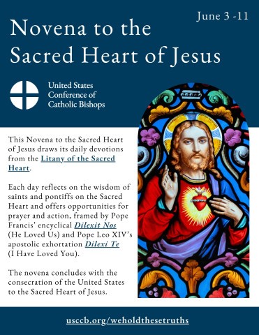 This Novena to the Sacred Heart of Jesus draws its daily devotions from the Litany of the Sacred Heart. Each day reflects on the wisdom of saints and pontiffs on the Sacred Heart and offers opportunities for prayer and action, framed by Pope Francis’ encyclical Dilexit Nos (He Loved Us) and Pope Leo XIV’s apostolic exhortation Dilexi Te (I Have Loved You). Join the U.S. Church from June 3-11 in praying this Novena to the Sacred Heart, which will conclude with the consecration of the United States to the Sacred Heart of Jesus.