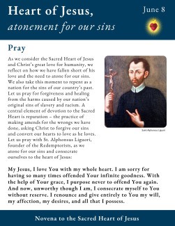 As we consider the Sacred Heart of Jesus and Christ’s great love for humanity, we reflect on how we have fallen short of his love and the need to atone for our sins. We also take this moment to repent as a nation for the sins of our country’s past. Let us pray for forgiveness and healing from the harms caused by our nation’s original sins of slavery and racism. A central element of devotion to the Sacred Heart is reparation – the practice of making amends for the wrongs we have done, asking Christ to forgive our sins and convert our hearts to love as he loves. Let us pray with St. Alphonsus Liguori, founder of the Redemptorists, as we atone for our sins and consecrate ourselves to the heart of Jesus: