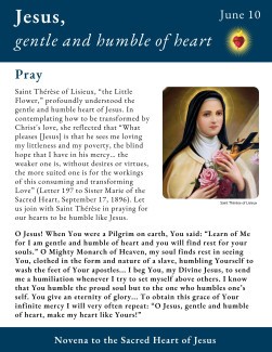 Saint Thérèse of Lisieux, “the Little Flower,” profoundly understood the gentle and humble heart of Jesus. In contemplating how to be transformed by Christ's love, she reflected that “What pleases [Jesus] is that he sees me loving my littleness and my poverty, the blind hope that I have in his mercy… the weaker one is, without desires or virtues, the more suited one is for the workings of this consuming and transforming Love” (Letter 197 to Sister Marie of the Sacred Heart, September 17, 1896). Let us join with Saint Thérèse in praying for our hearts to be humble like Jesus.