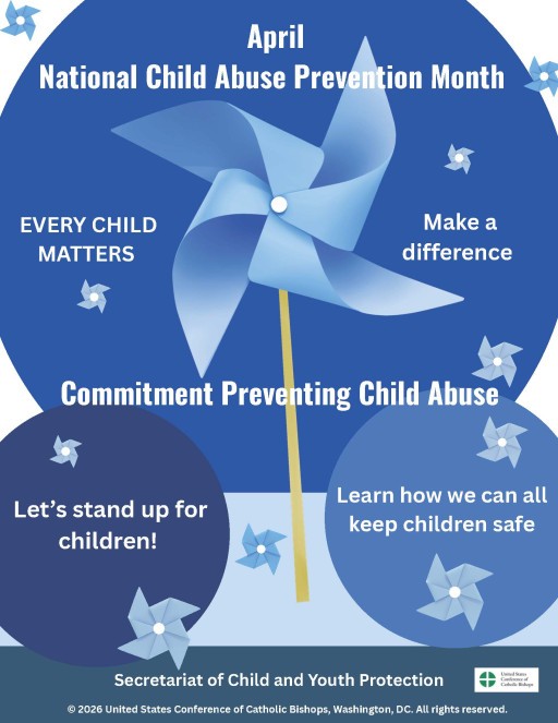 April is National Child Abuse Prevention Month, and the awareness poster features a large blue pinwheel. Text reads: 'Every Child Matters – Make a Difference' and 'Commitment Preventing Child Abuse.' Includes messages: 'Let’s stand up for children!' and 'Learn how we can all keep children safe.' From the Secretariat of Child and Youth Protection, United States Conference of Catholic Bishops (USCCB), 2026.
